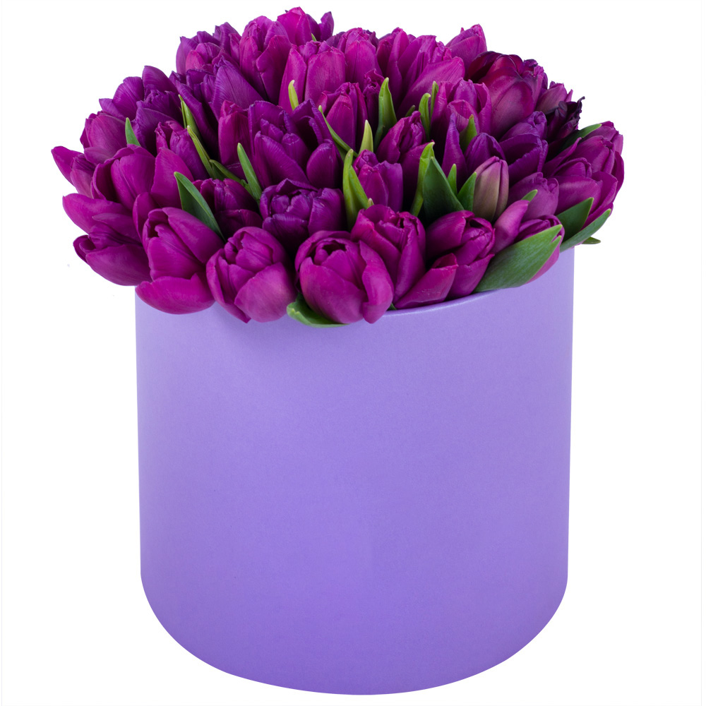 51 фиолетовый тюльпан в фиолетовой шляпной коробке