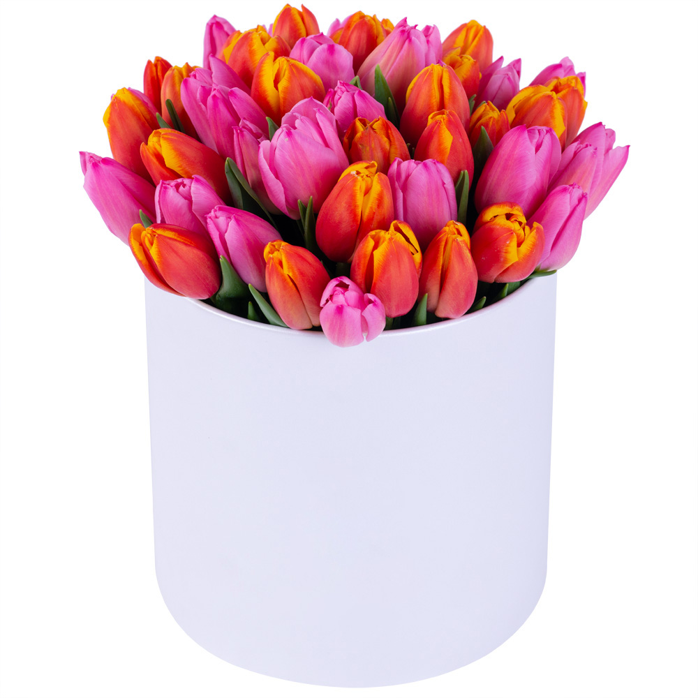 Букет микс из 51 тюльпана в белой шляпной коробке