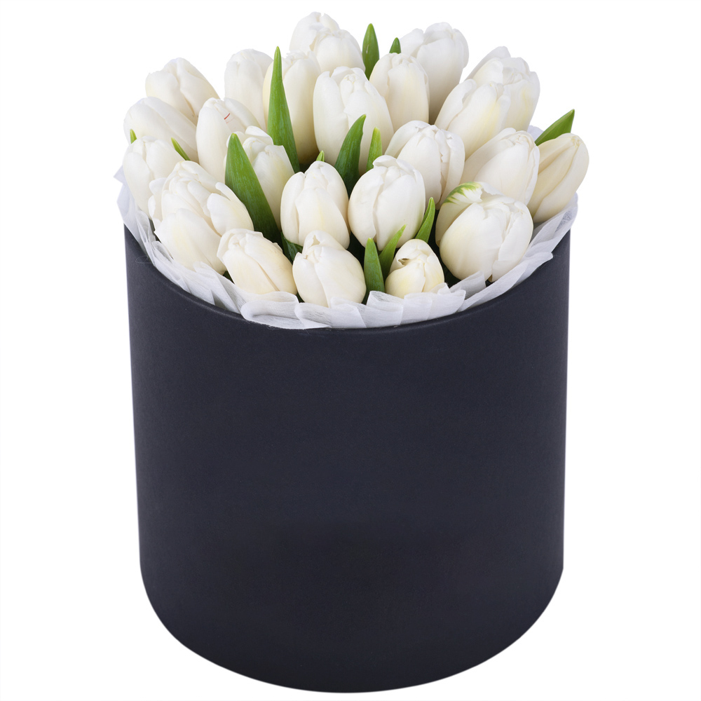 25 белых тюльпан в черной шляпной коробке