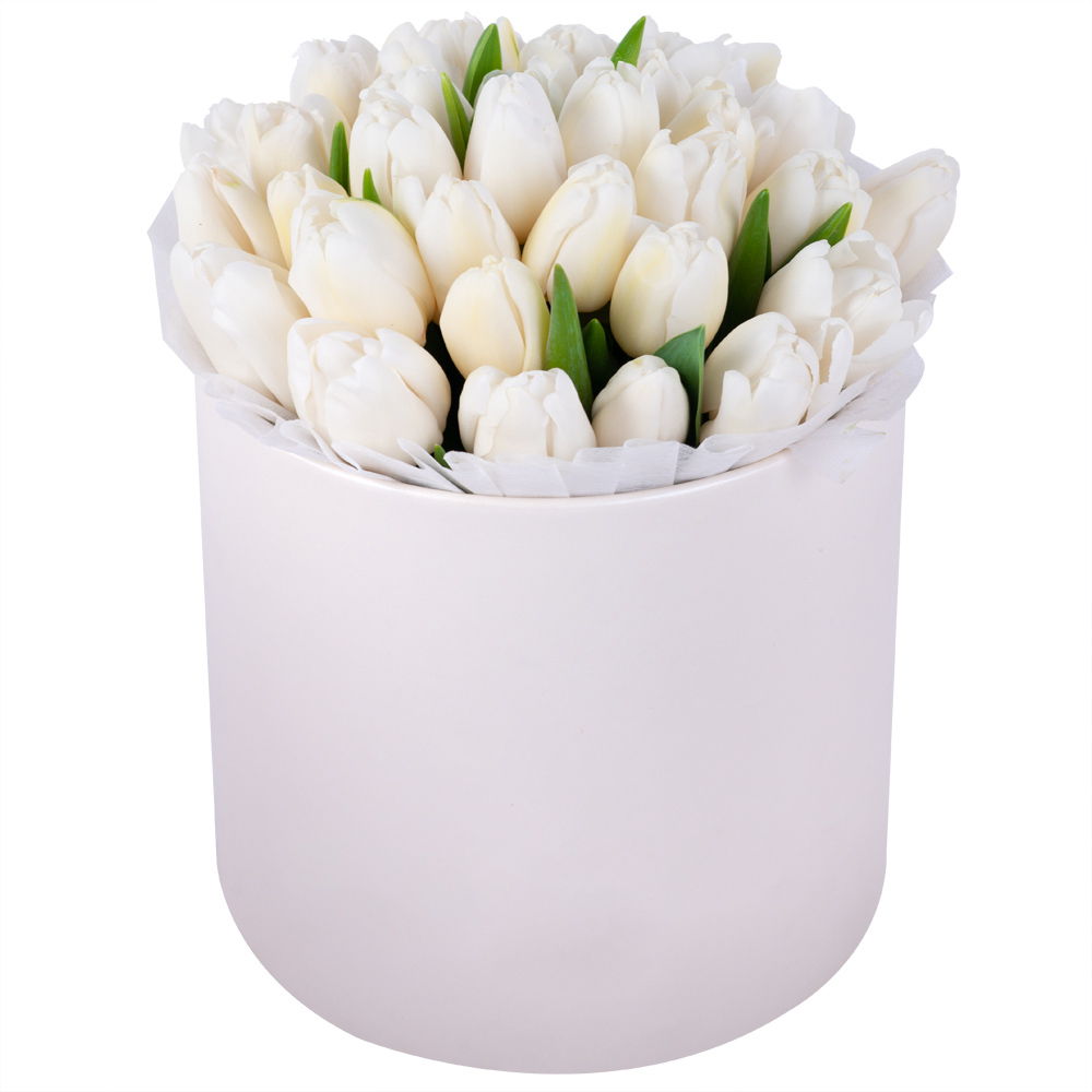 35 белых тюльпан в кремовой шляпной коробке