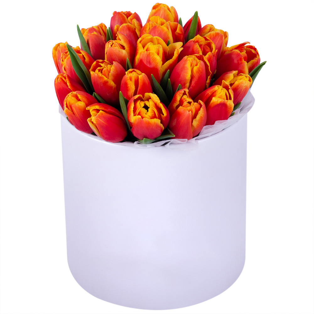 25 огненных тюльпан в белой шляпной коробке