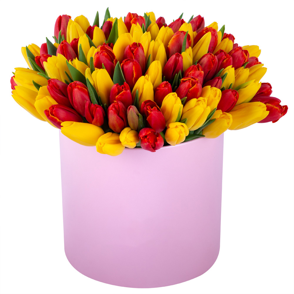 Букет из 101 разноцветного тюльпана в розовой шляпной коробке