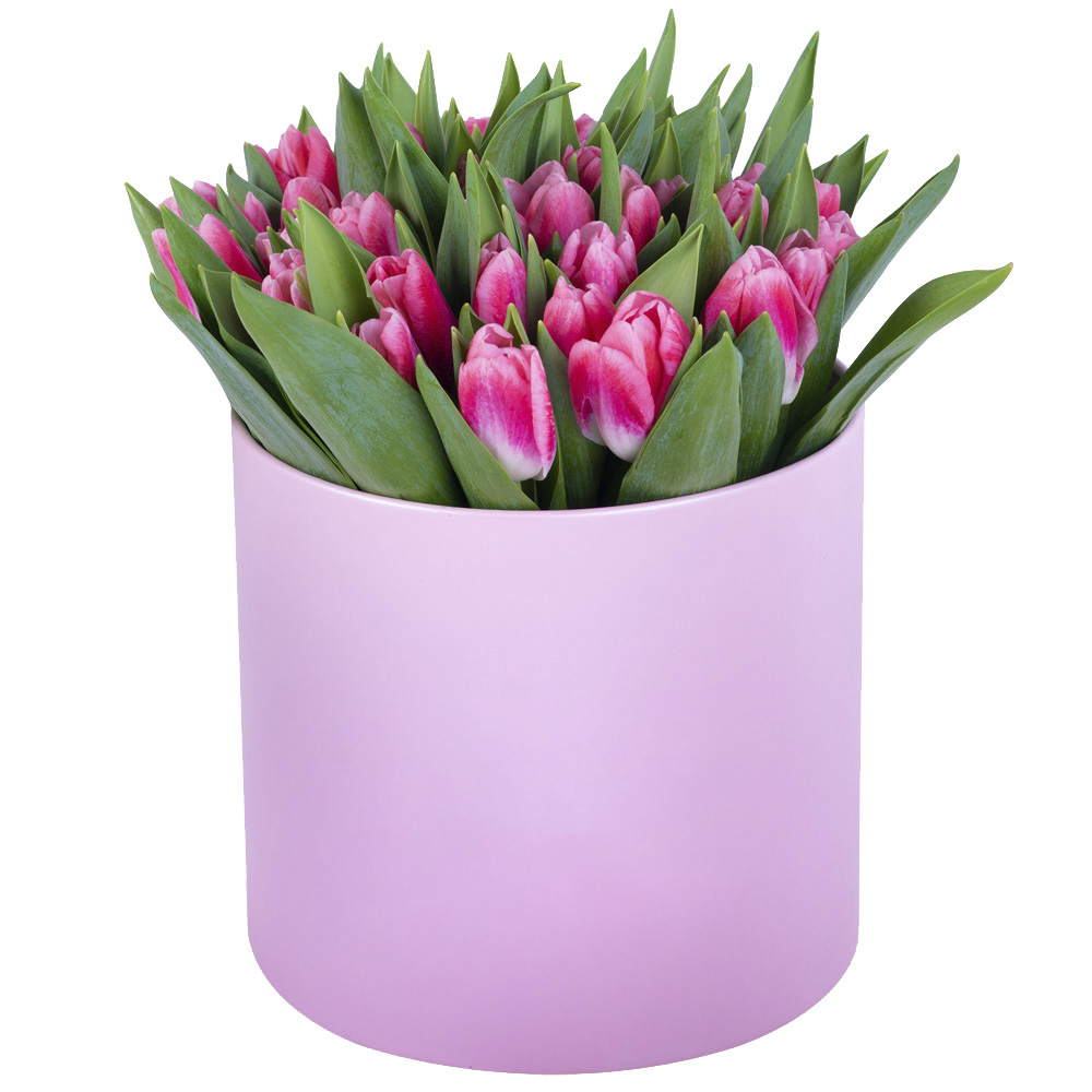 51 Бело-малиновый тюльпан в розовой шляпной коробке