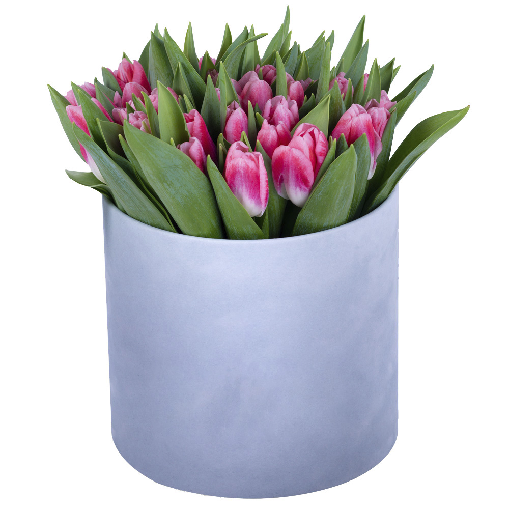 51 Бело-малиновый тюльпан в серой бархатной шляпной коробке