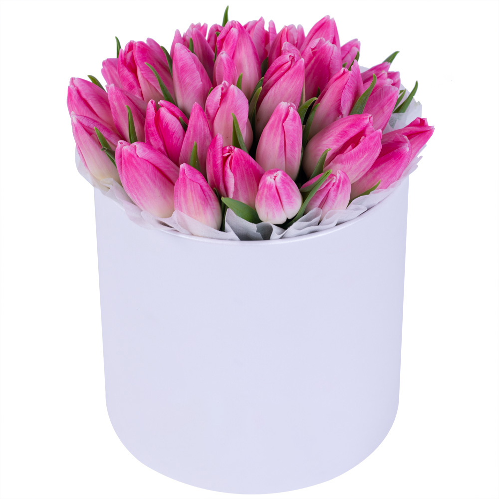 35 розовых тюльпан в белой шляпной коробке